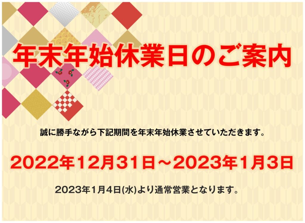NEWS 年末年始休業日のお知らせ 2022年12月26日 2022年12月26日 年末年始休業日のご案内です。平素は格別のお引き立てを賜り、厚く御礼申し上げます。誠に勝手ながら、下記の期間休業日とさせていただきます。12/31(土)~1/3(火)休業期間中は何かとご迷惑をおかけいたしますが、何卒ご了承のほど、お願い申し上げます。 Follow me! バーベキュー開催予定 2023年5月バーベキュー開催 コメントを残す コメントをキャンセルメールアドレスが公開されることはありません。 ※ が付いている欄は必須項目ですコメント名前* メール* サイト 自分の名前、メール、そしてサイトURLを次にコメントを投稿するときのために自分のブラウザに保存する